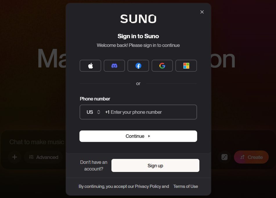1. Зайдите на suno.com. Авторизуйтесь через логин и пароль.