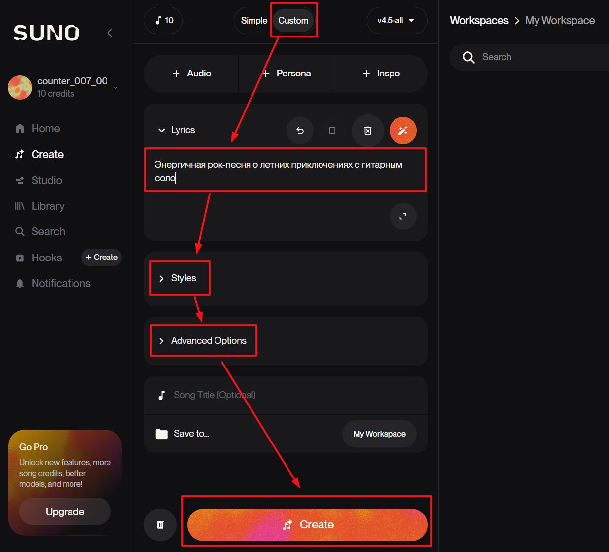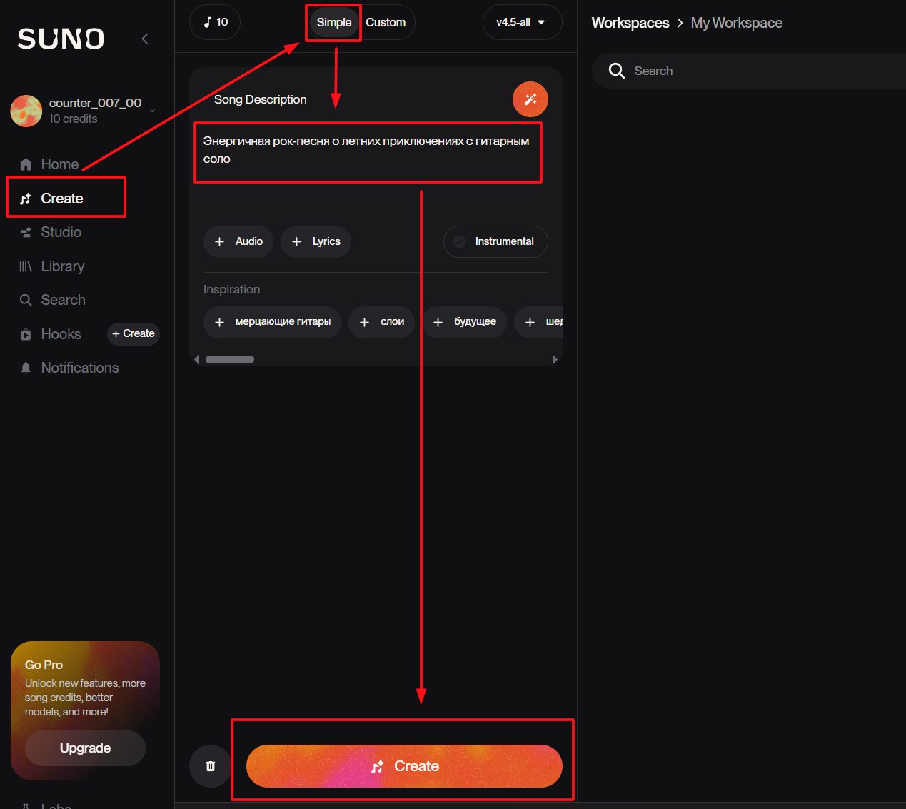- Create — рабочее пространство для генерации музыки со всеми инструментами